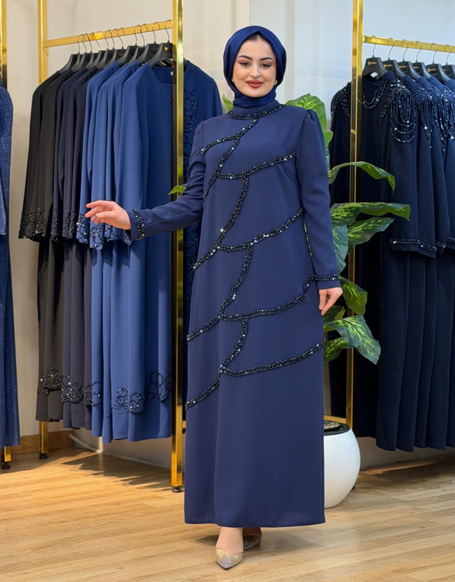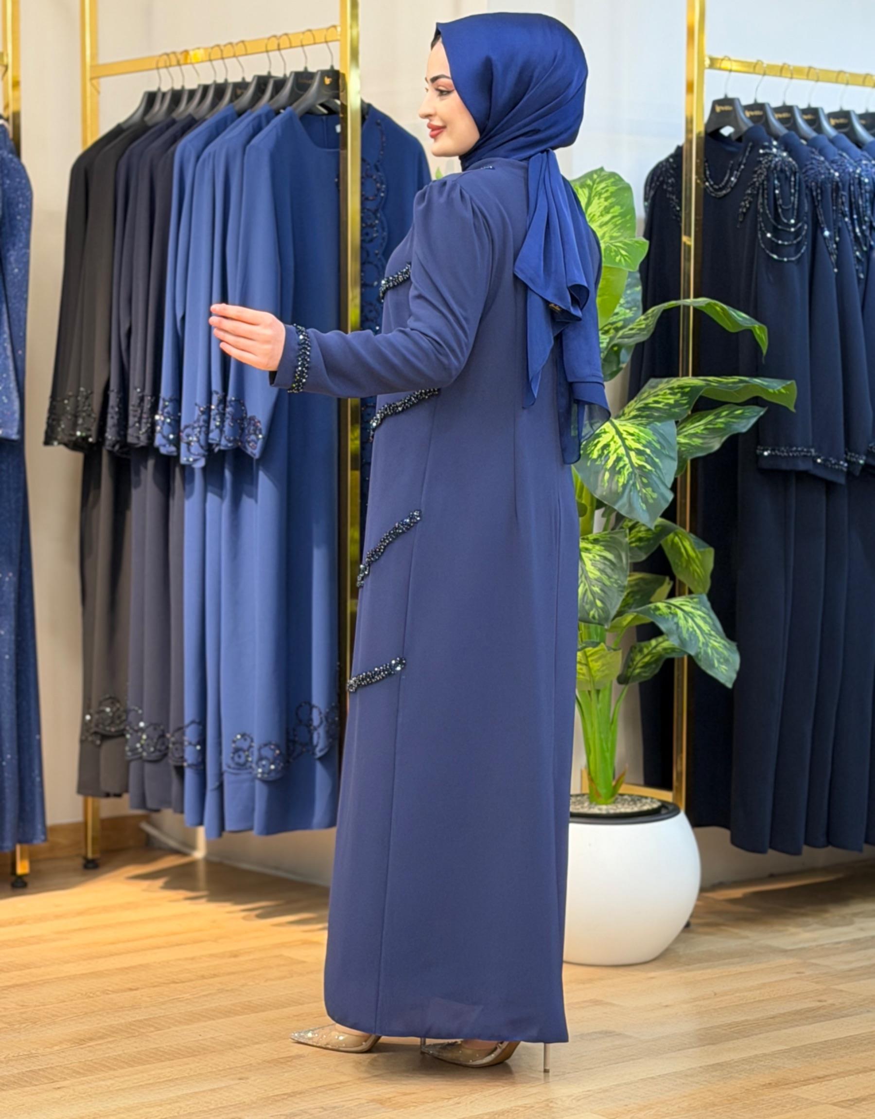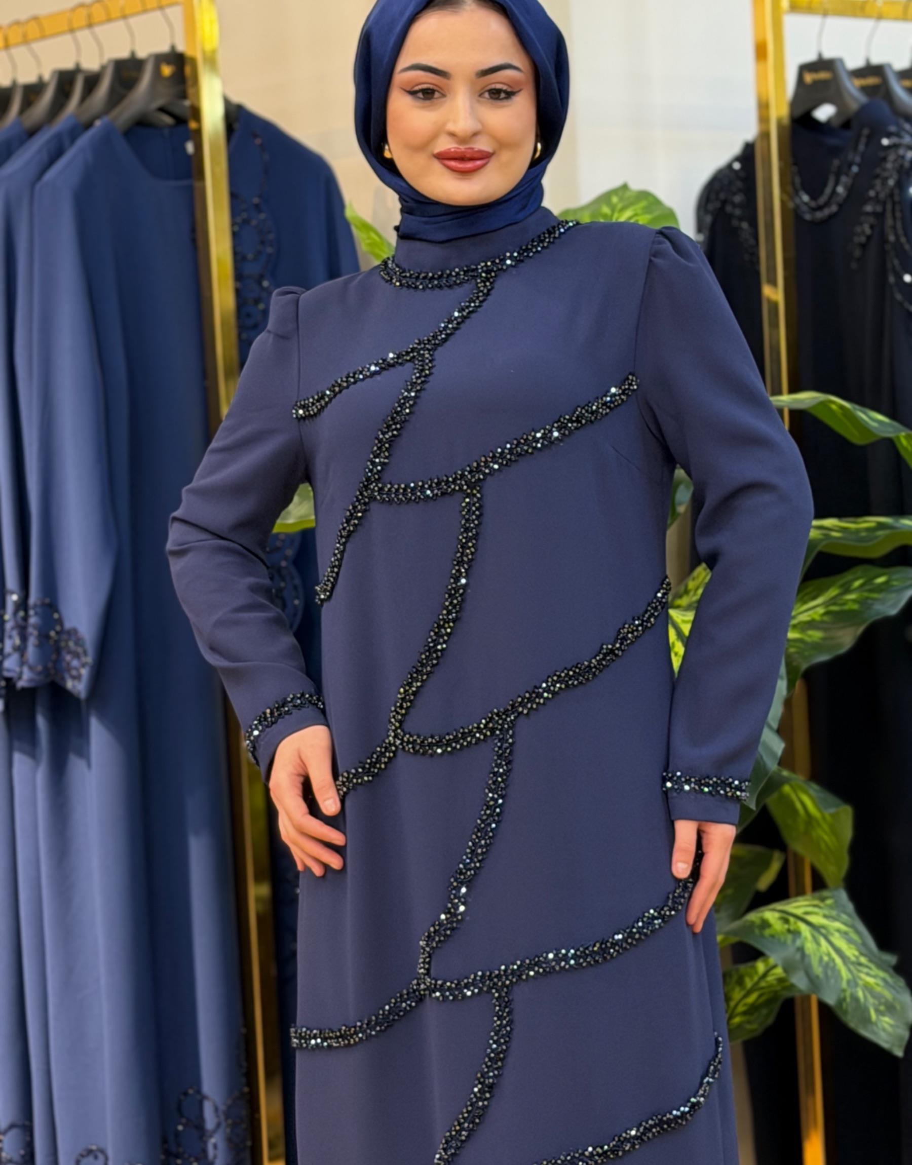 Bayan Lacivert 6225 Desen Taş İşleme elbise | Nuripeğim