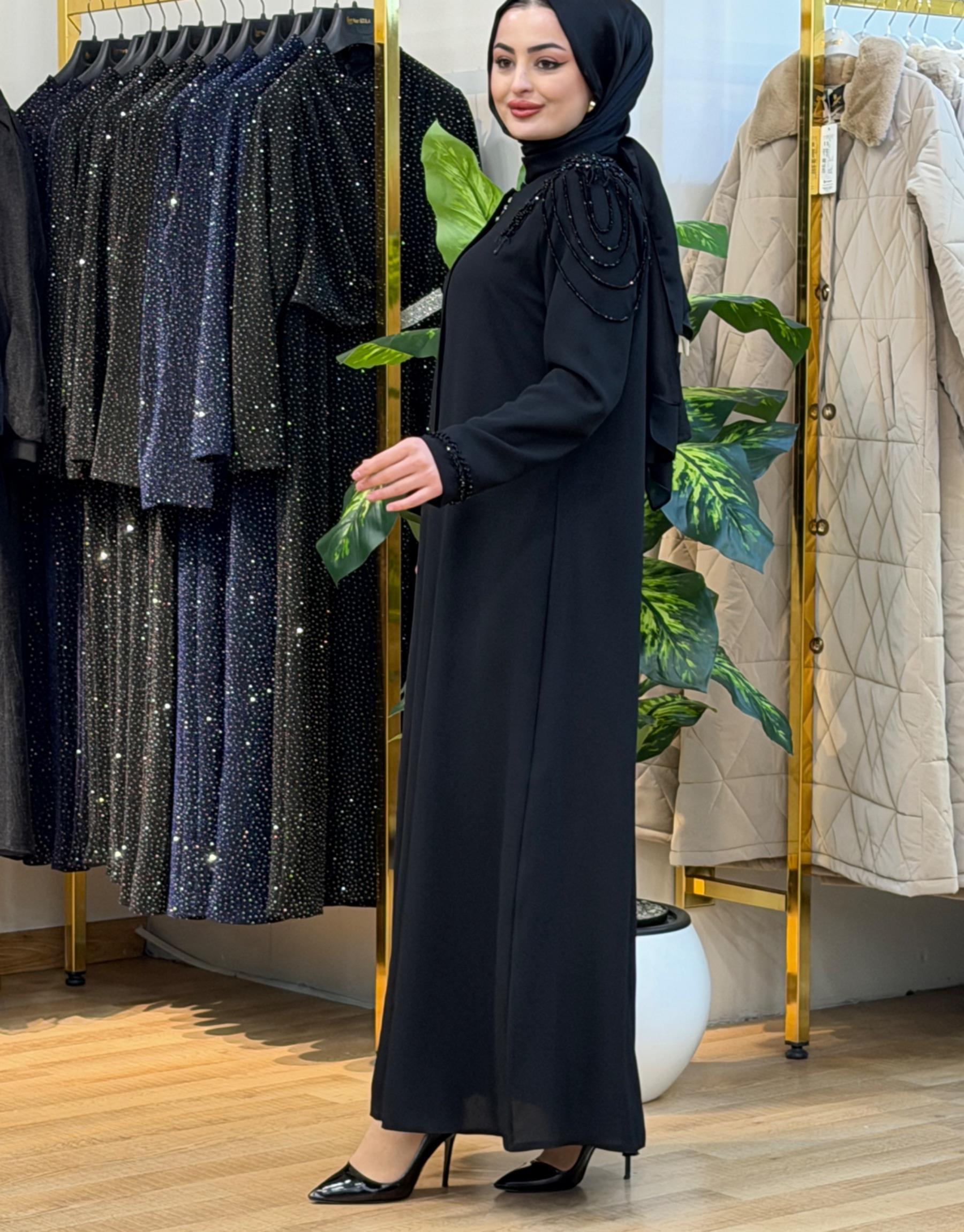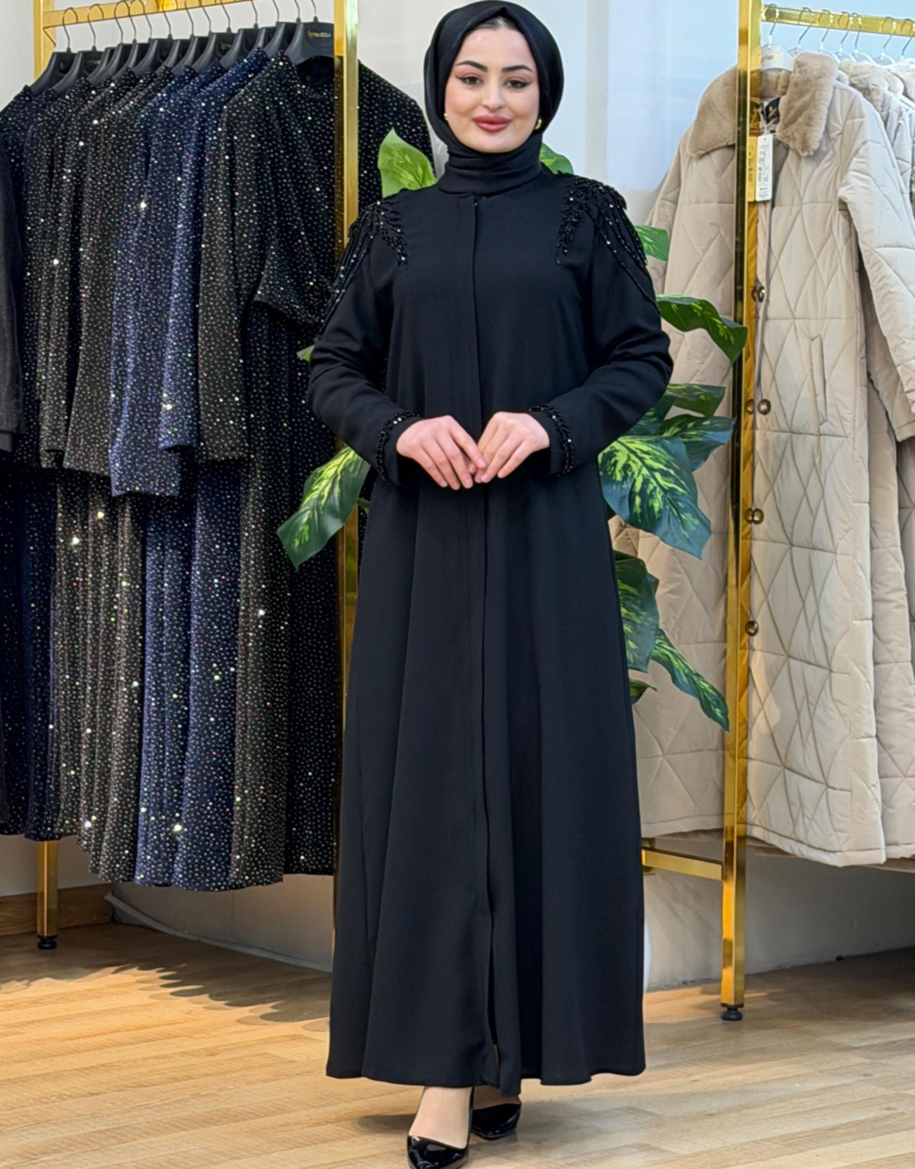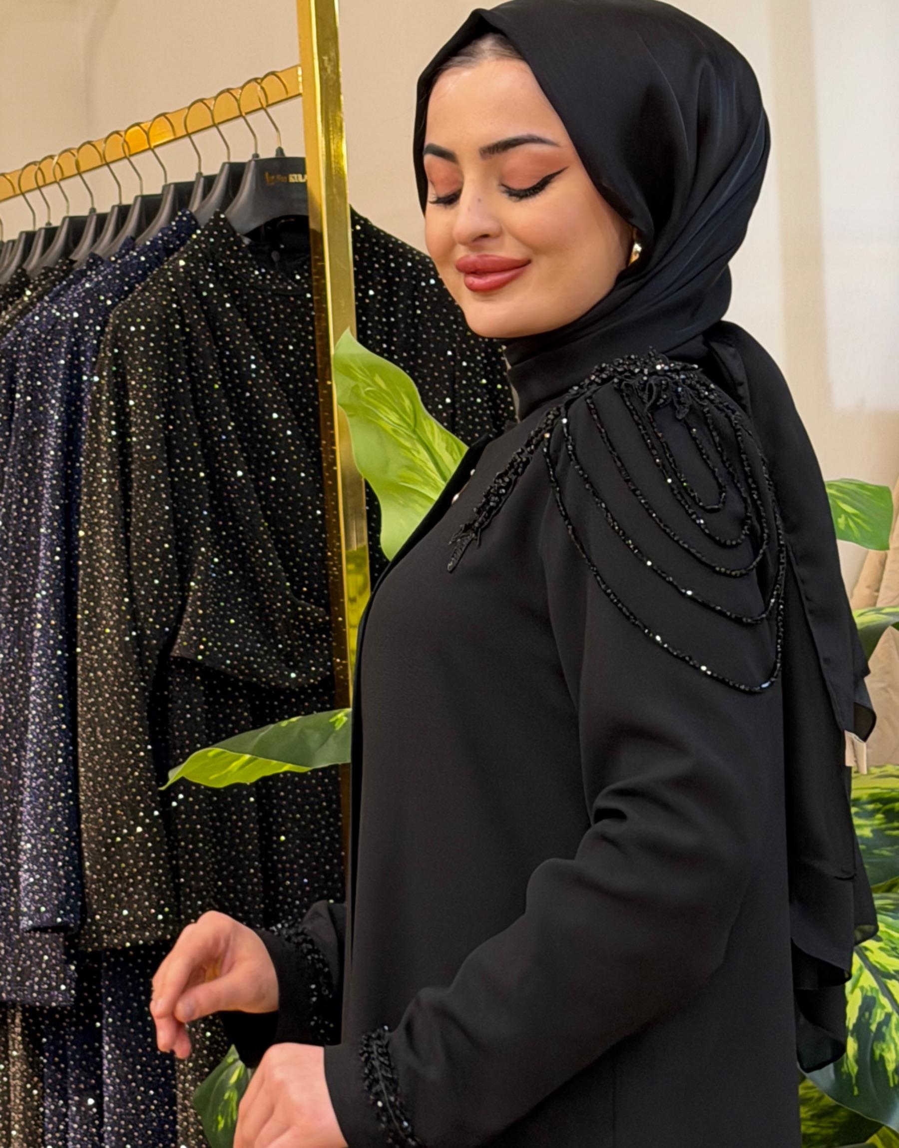 45686 Patı ve kolu Yaprak desen taşlı Ferace Siyah Gümüş