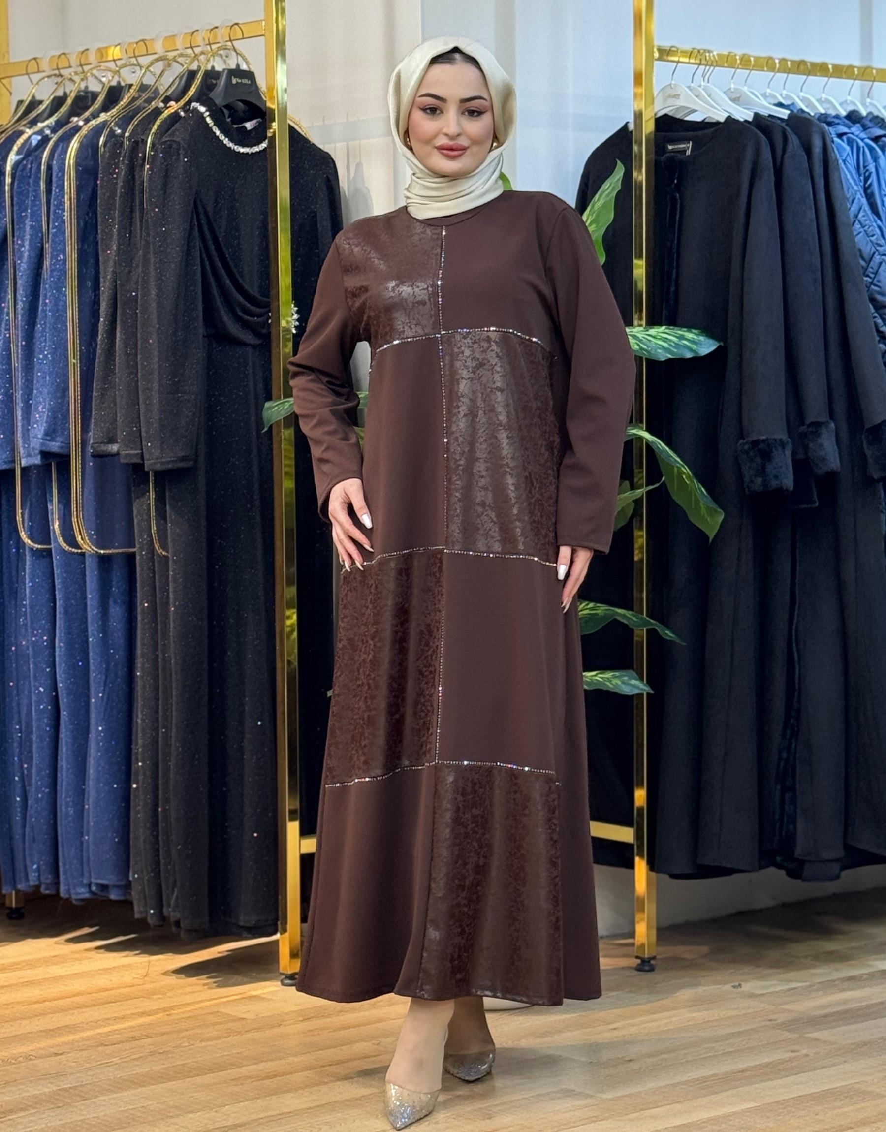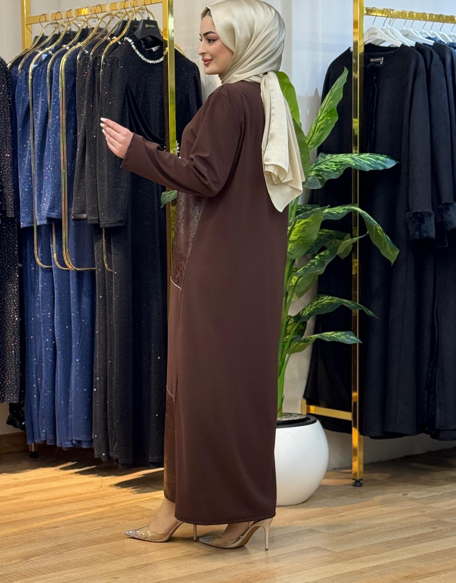 Bayan Kahve 7408 Krep Taşlı Elbise | Nuripeğim